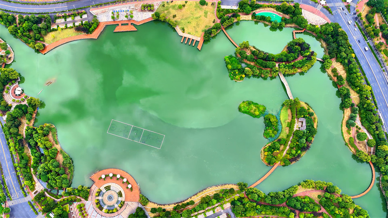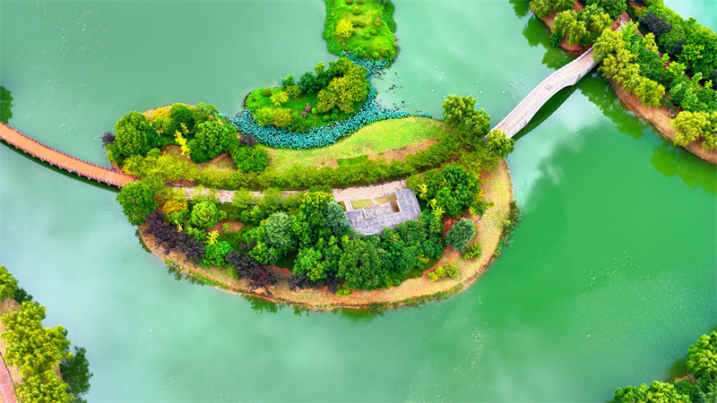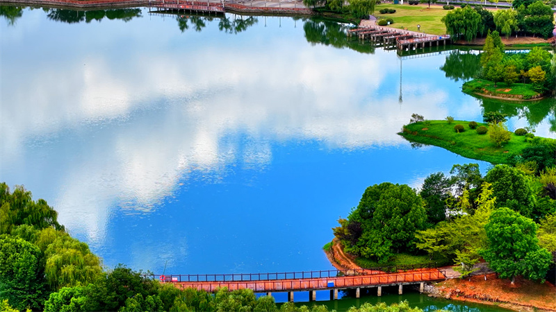 雨后的安徽铜陵临津湖湖面如镜,倒映着湛蓝的天空,洁白的云朵仿佛在湖中穿行,湖畔绿树成茵,映衬着一湖美景。