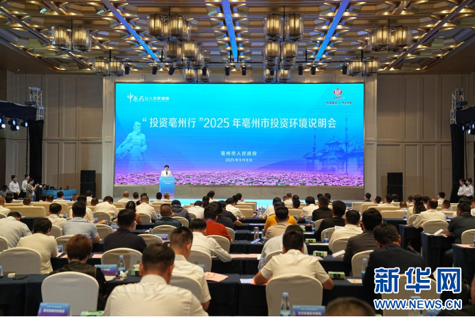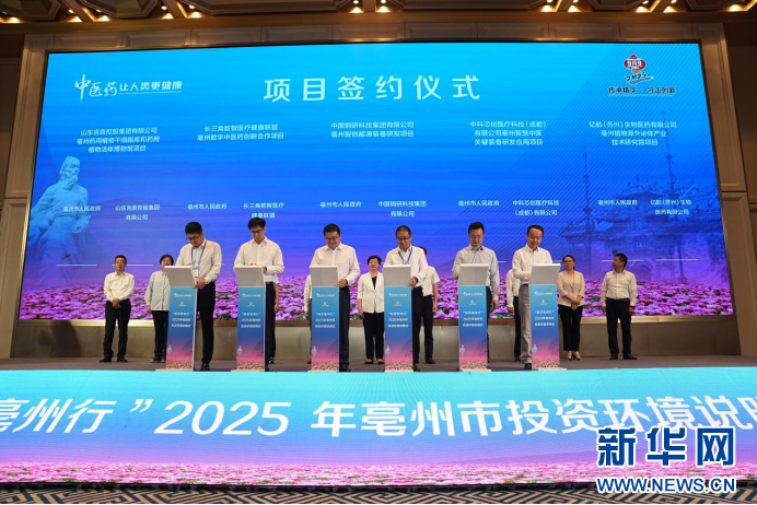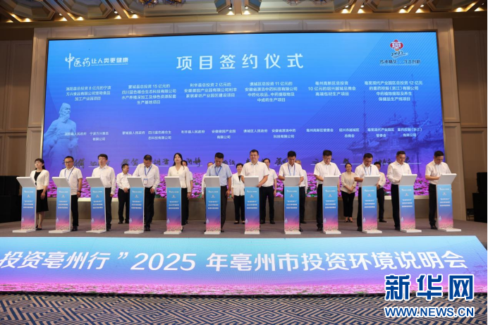 新华网合肥9月8日电(吴万蓉)9月8日,“投资亳州行”2025年亳州市投资环境说明会在亳州举行,现场集中签约41个项目。其中,产业类项目30个,总投资390亿元。