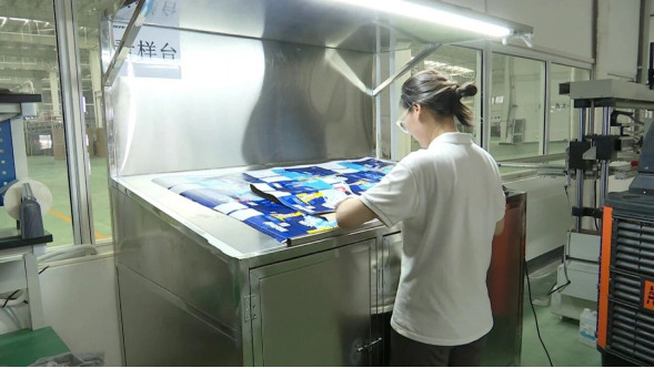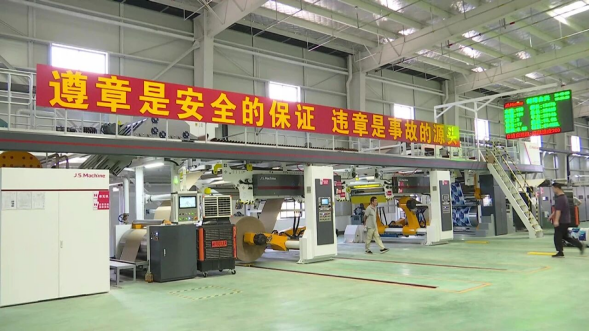 蚌埠合兴环保科技有限公司总经理丁才兵介绍:“我们蚌埠合兴生产的包装箱是环保的,可以溶于大气层、溶于水,我们的工艺特点是介于纸箱和彩印之间,更加高效率,用途主要是在雪花、青啤、百威等一些大订单的预印。”