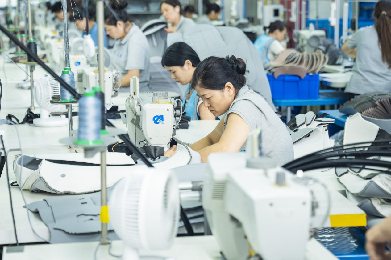 2025年8月13日,继峰座椅(合肥)有限公司的汽车座椅生产线上,工人们正在加工座椅套。(肥东县委宣传部供图)