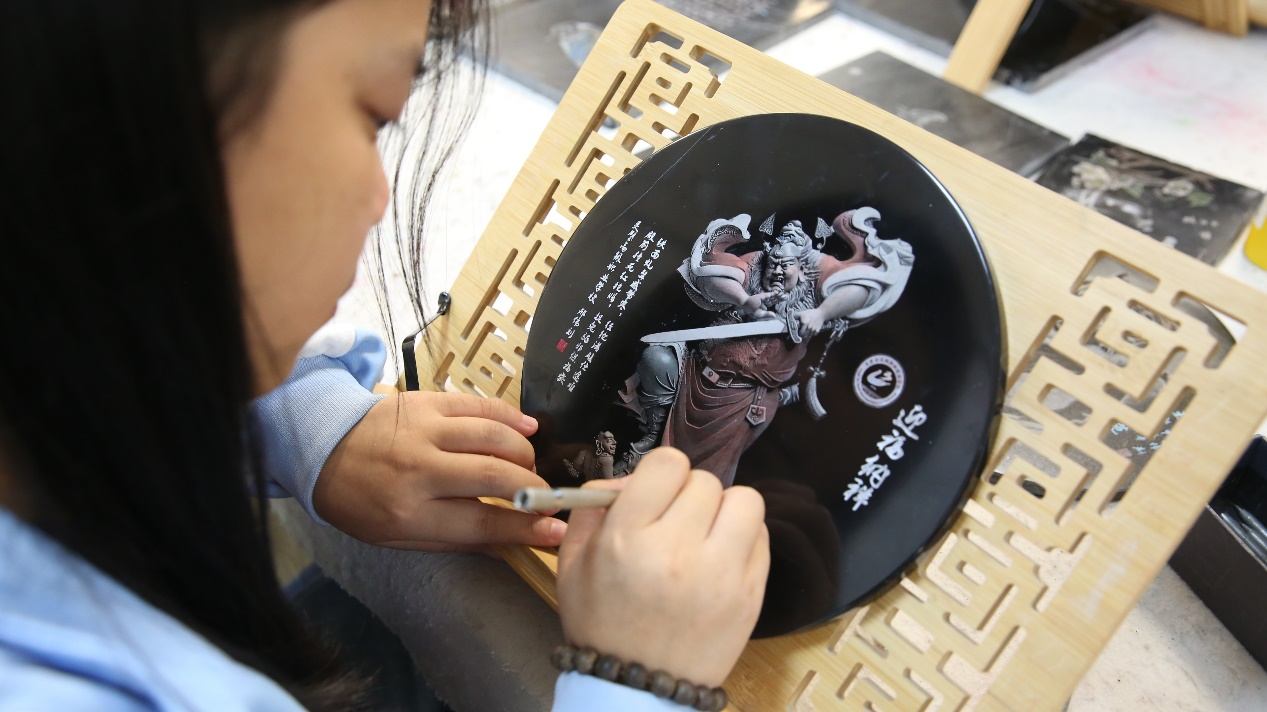 9月11日,在安徽省灵璧县高级职业技术学校非遗传承学院内,一名学生正在学习雕刻钟馗形象。