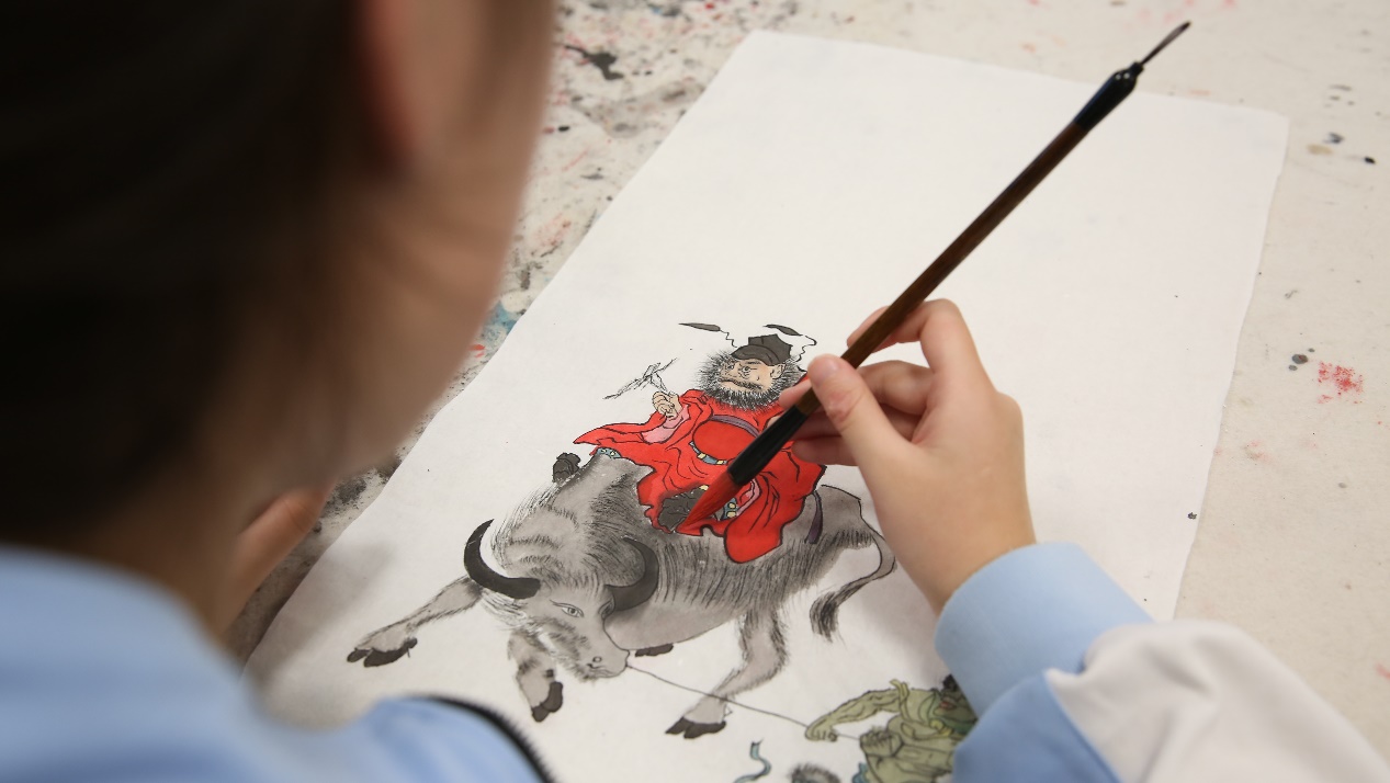 9月11日,在安徽省灵璧县高级职业技术学校非遗传承学院内,一名学生正在学习画钟馗。