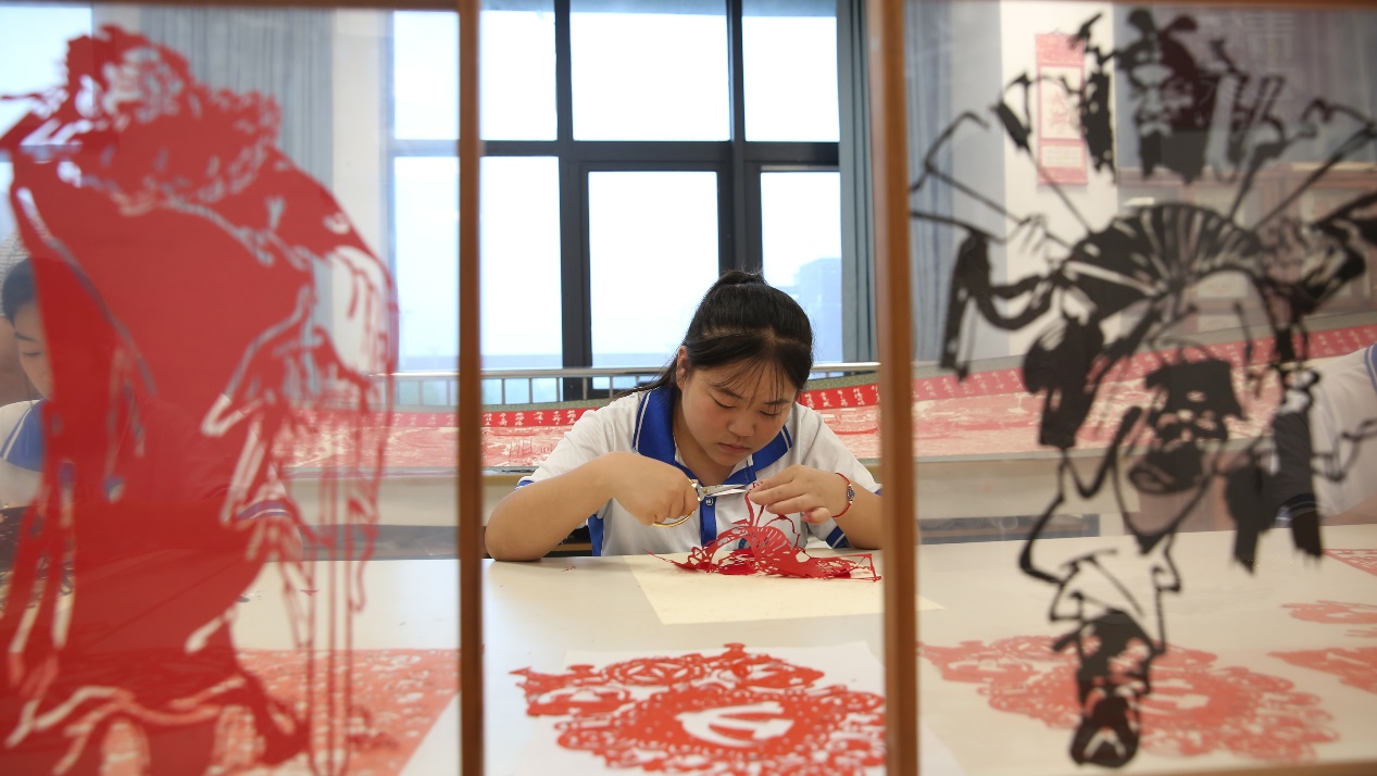 9月11日,在安徽省灵璧县高级职业技术学校非遗传承学院内,一名学生正在学习剪钟馗画。