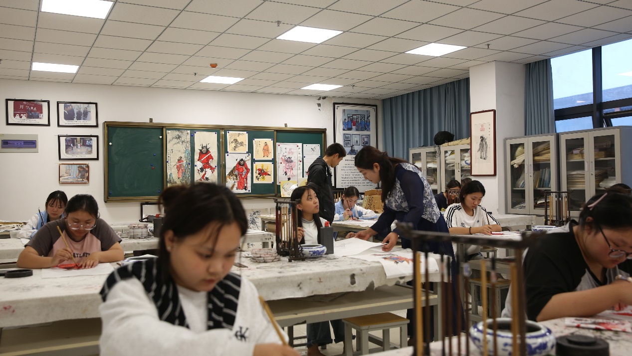 9月11日,在安徽省灵璧县高级职业技术学校非遗传承学院内,学生们正在学习画钟馗。