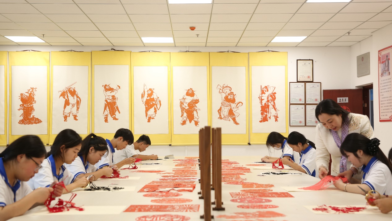 9月11日,在安徽省灵璧县高级职业技术学校非遗传承学院内,学生们正在学习剪钟馗画。