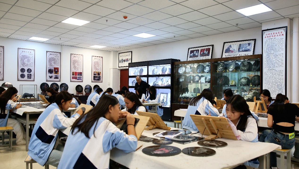 9月11日,在安徽省灵璧县高级职业技术学校非遗传承学院内,学生们正在学习雕刻钟馗形象。