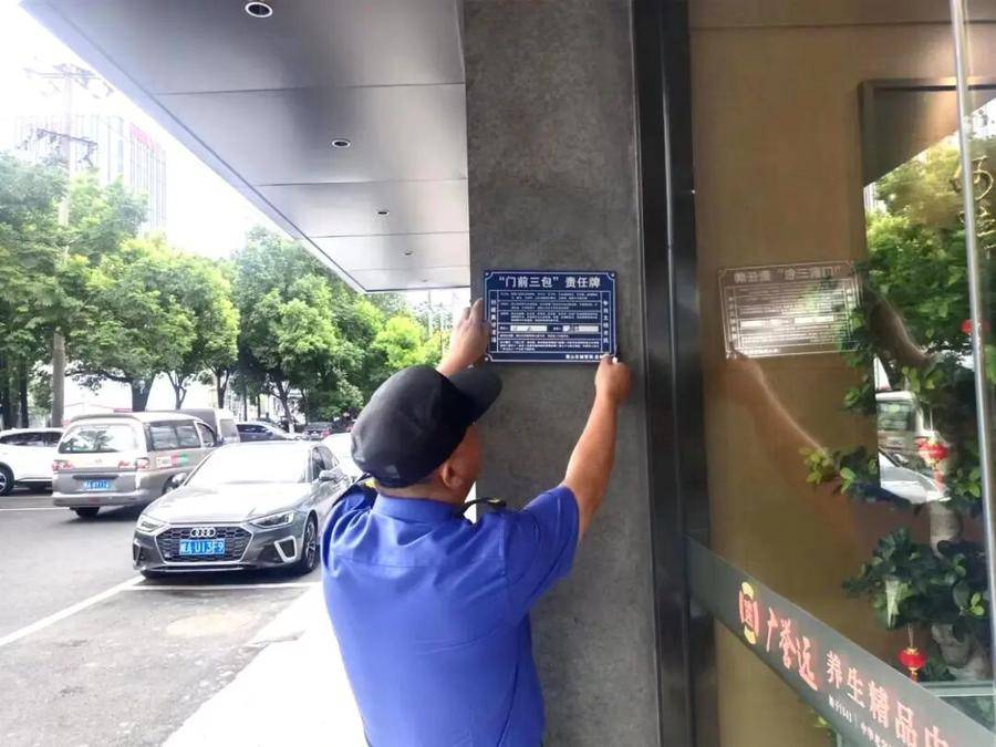稻香村街道城管队员在辖区商业楼宇粘贴“门前三包”责任牌。