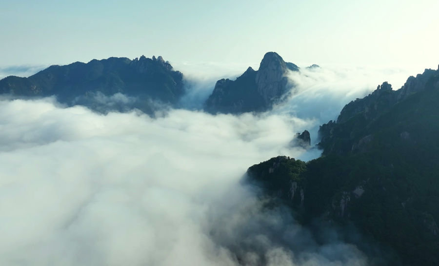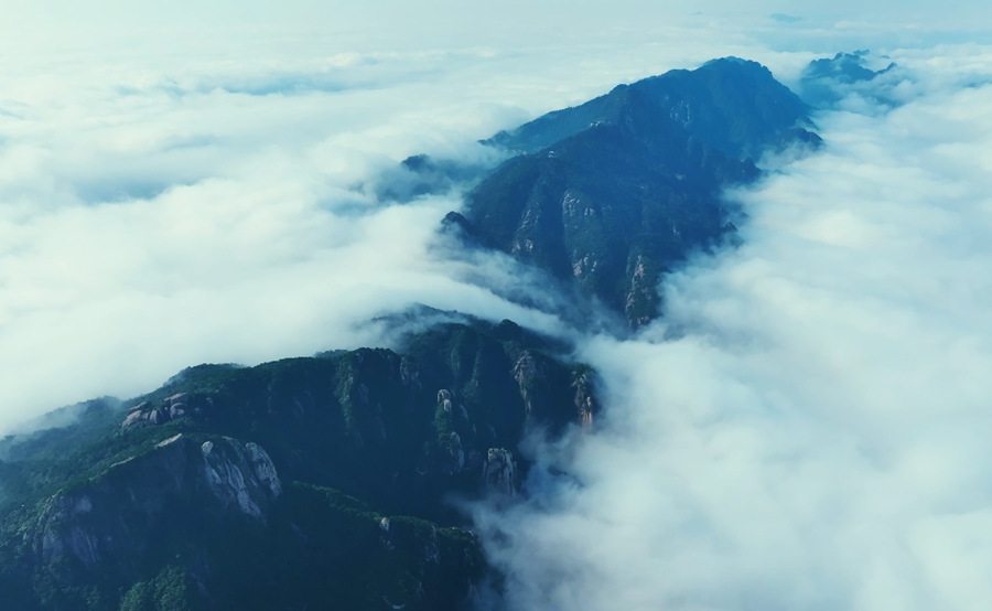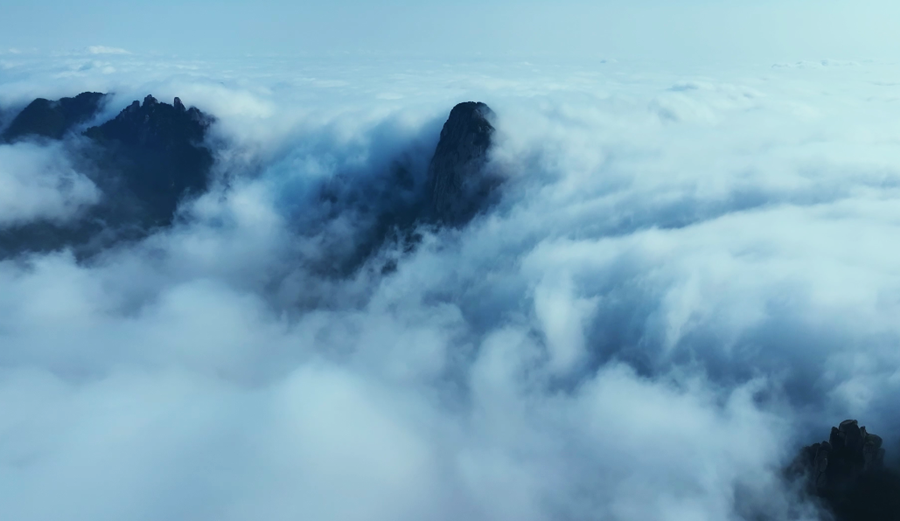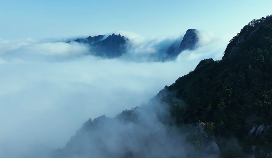 近日,安徽省池州市九华山花台景区出现壮美的云海景观,云雾缭绕,群峰若隐若现,宛如一幅水墨画卷,美不胜收。(饶治国、胡彬)