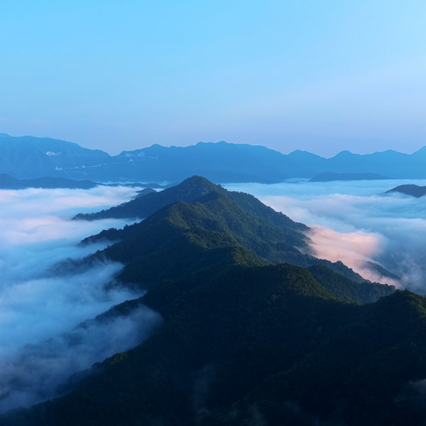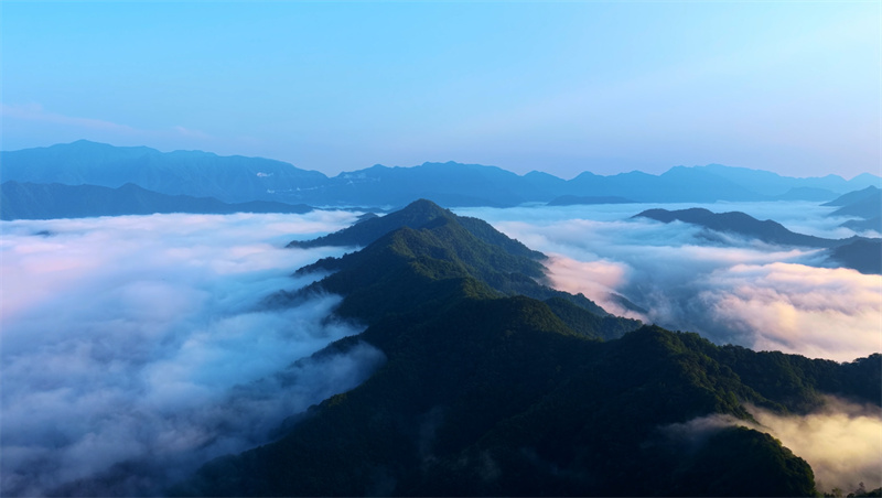 近日,安徽省池州市仙寓山云雾缭绕,云海在山峦间缓缓涌动,似白色绸缎铺满山谷,宛如画卷。