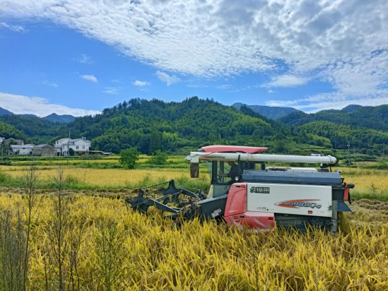 金秋时节,稻谷飘香。走进旌德县旌阳镇板桥村,广阔的田野上金黄一片,稻浪翻滚,收割机轰鸣作响,村民们脸上洋溢着喜悦的笑容,呈现出一派繁忙的丰收景象。