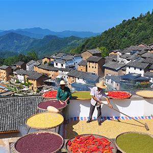 近日,安徽省黄山市歙县深渡镇阳产村迎来一年中最绚烂的时节。当地村民利用晴好天气,将新收获的各种农作物晾晒于房前屋后、窗台屋顶,宛如一幅天然绘就的秋日油画。(樊成柱 施亚磊 摄)