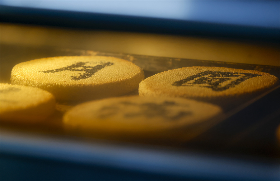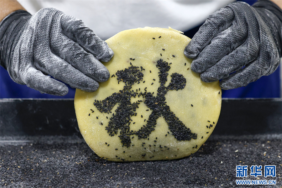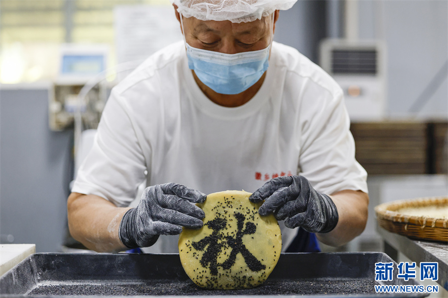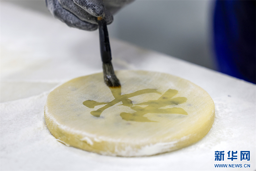 9月18日,安徽省黄山市祁门县,制饼手艺人给月饼上的字沾上黑芝麻。
