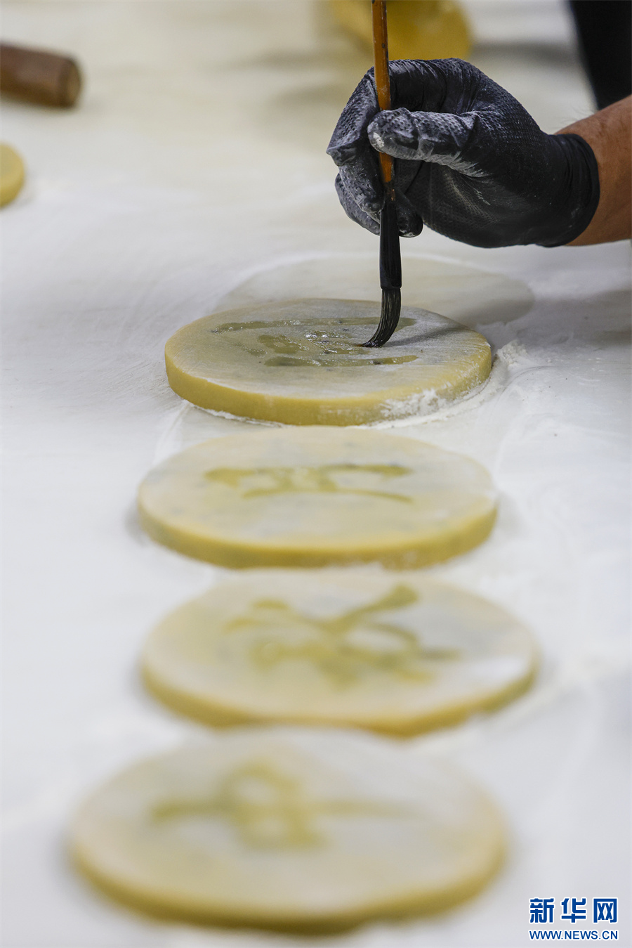 9月18日,安徽省黄山市祁门县,制饼手艺人用糖浆在月饼上写字。