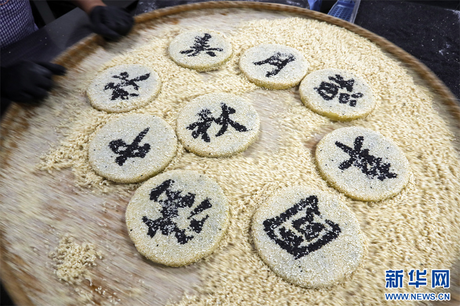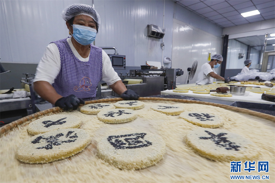 9月18日,安徽省黄山市祁门县,制饼手艺人将月饼摇匀上白芝麻。
