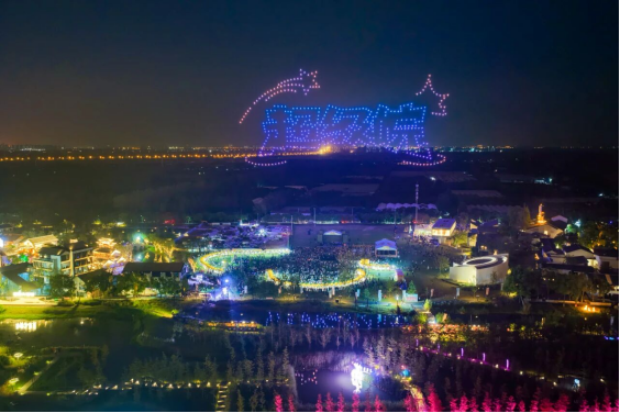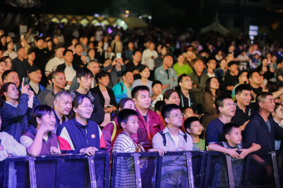 磨滩大街上,“超级有趣街区游”成为人气焦点,演员们“化身”豆腐西施、武大郎,走进店铺与游客互动并派发“银票”。“超级好听音乐会”同步开启,超人气组合带来精彩演出,现场观众跟着旋律合唱,掌声不断。夜晚,千架无人机缓缓升空,璀璨灯光点亮夜空。