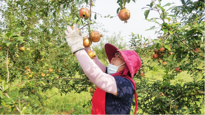 在茨淮新河畔的怀远天兆石榴基地,果实累累,挂满枝头。果农们正有序采摘,并对果实进行分级、包装等后续处理。