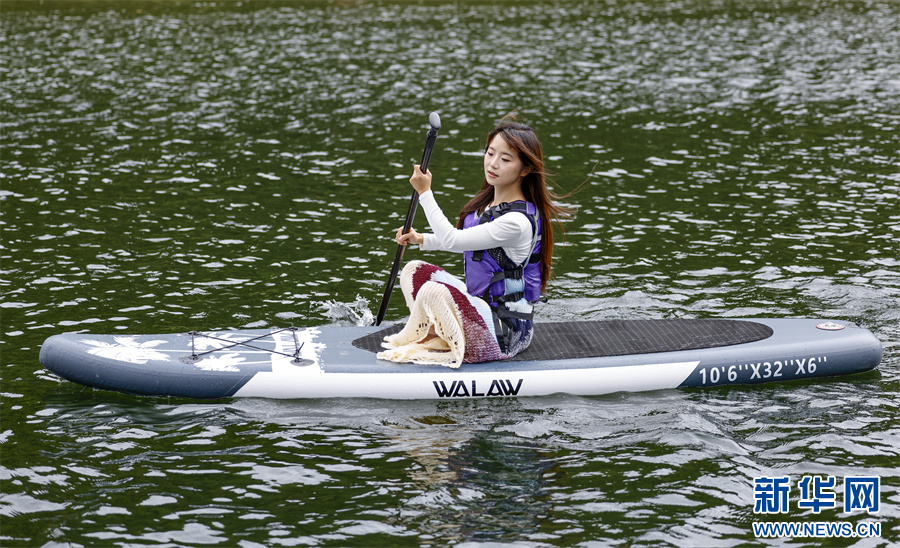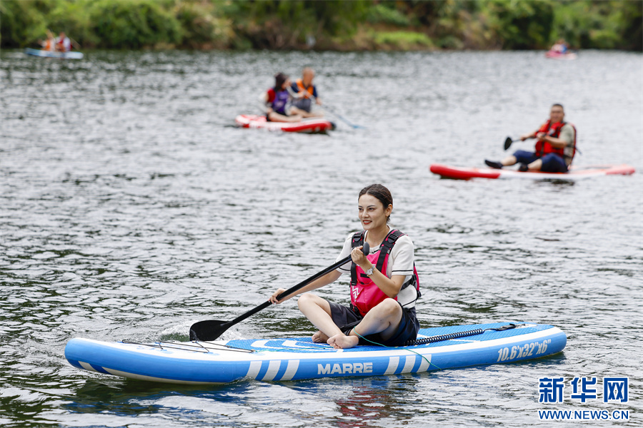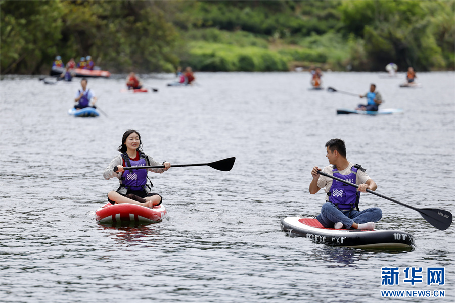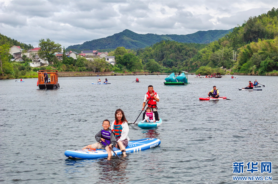 9月21日,安徽省黄山市祁门县芦溪乡奇口村,游客在体验桨板运动。