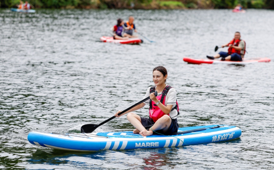 当日,安徽省黄山市祁门县芦溪乡奇口村风景旖旎,众多游客来此体验桨板运动,在绿水青山间乐享周末。