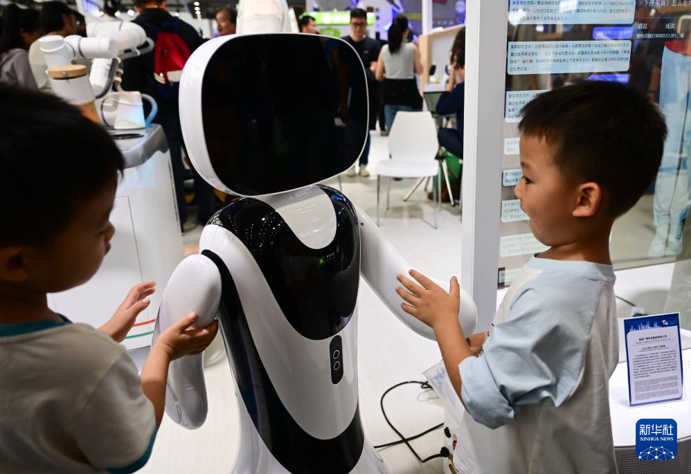 9月21日,小朋友在2025世界制造业大会智能机器人展区和一款机器人互动。