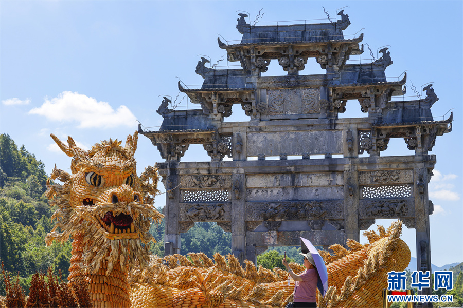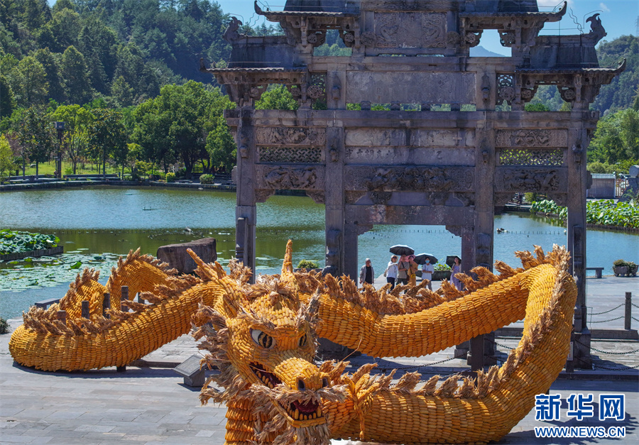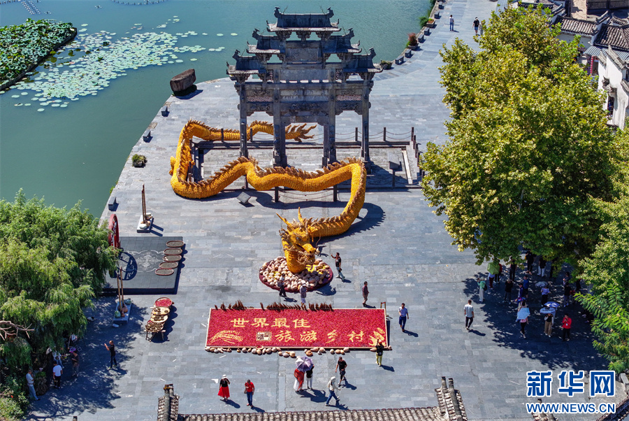 9月22日,游客在安徽省黄山市黟县西递古村落观赏用玉米组成的“巨龙”晒秋造型。