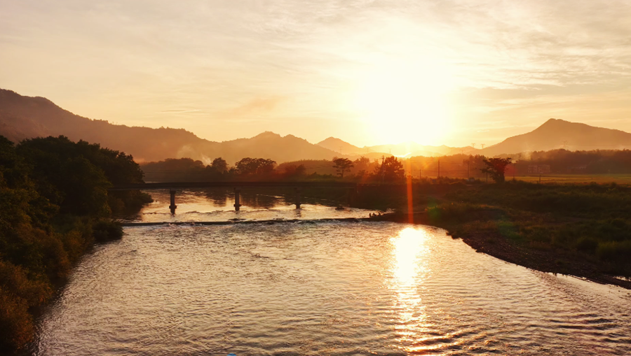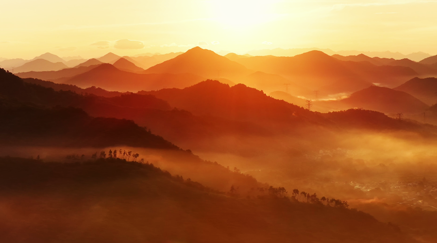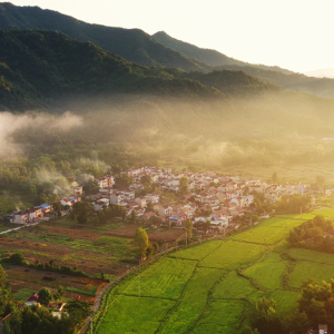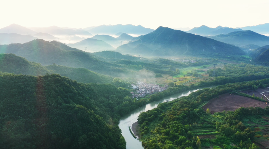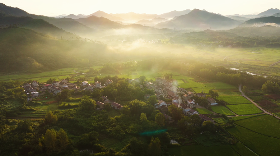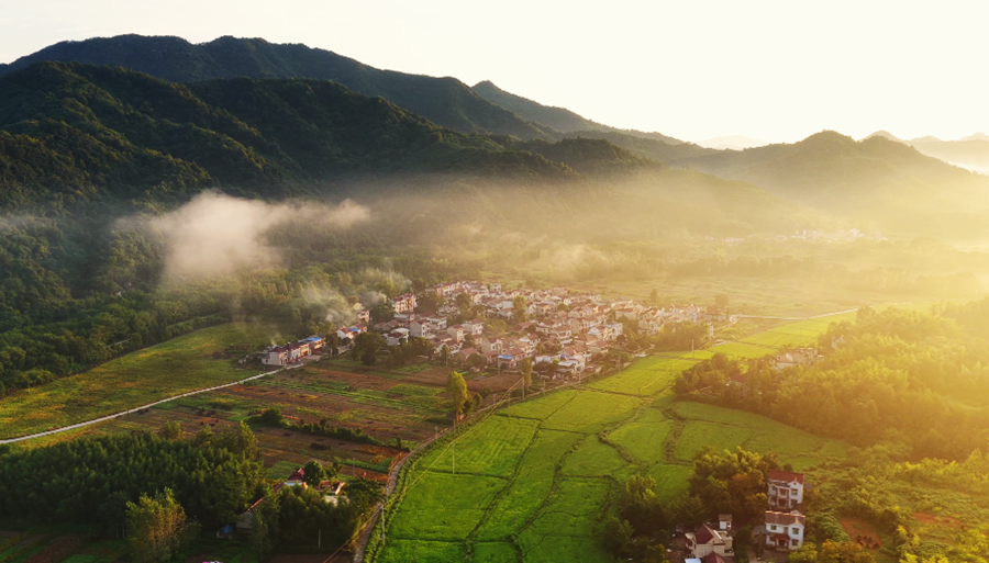 近日,位于安徽省池州市贵池区的龙庄村薄雾轻笼,村庄、河流、山川掩映在朦胧的雾色中,若隐若现,如诗如画。(饶治国、熊永满)
