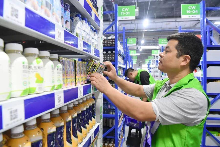 在小象超市蜀山区华亿站,分拣员将货品摆放整齐。