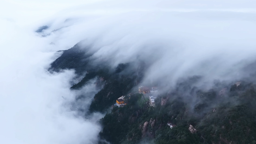 近日,安徽省池州市九华山出现云海景观。大面积流云在叠翠峰峦间翻滚流淌,如同江河奔腾,场面蔚为壮观。