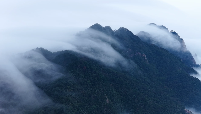 大面积流云在叠翠峰峦间翻滚流淌,如同江河奔腾,场面蔚为壮观。