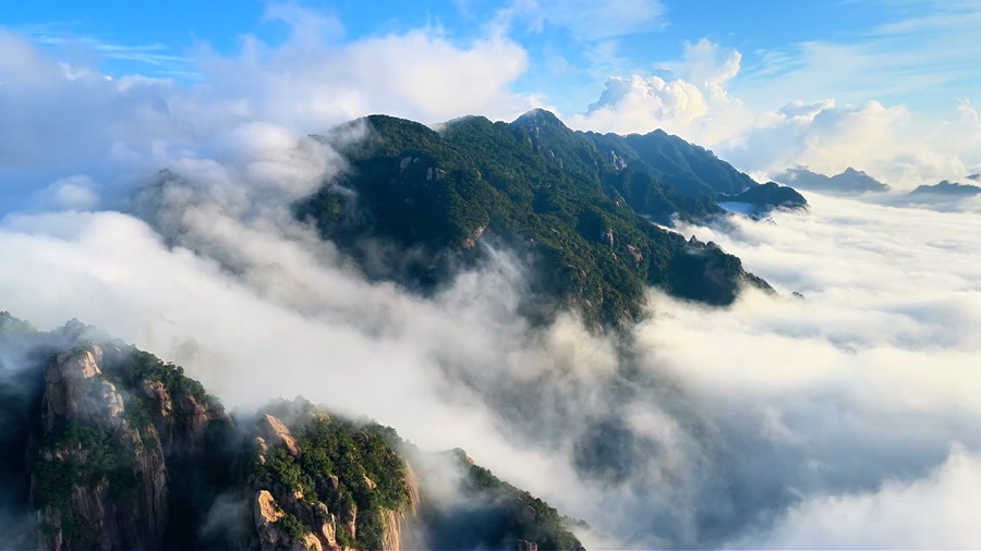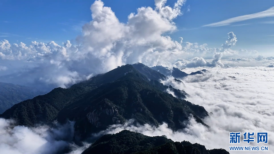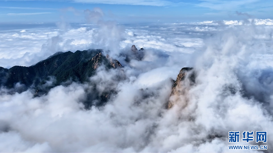 秋日时节,位于安徽省池州市的九华山花台景区云海澎湃、波涛奔涌,山峦若隐若现,尽显大自然的神奇与秀丽。(储成胜)