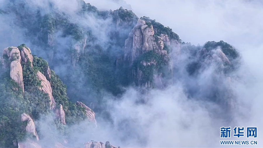 秋日时节,位于安徽省池州市的九华山花台景区云海澎湃、波涛奔涌,山峦若隐若现,尽显大自然的神奇与秀丽。