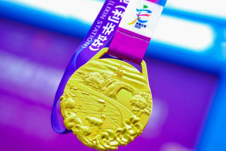 完赛奖牌以“西淝河国家湿地公园”为主题,匠心独运。正面盛放的黄蜀葵寓意产业振兴,融入稻田、水纹与黄牛耕影,展现生态与农耕的和谐共生。背面西淝河水波轻漾,跑者们矫健的步伐穿梭其间,传递出全民健身与自然共融的理念。五大元素——繁花、稻浪、耕牛、流水与跑者,共同绘就利辛生态发展与乡村振兴的美好图景。