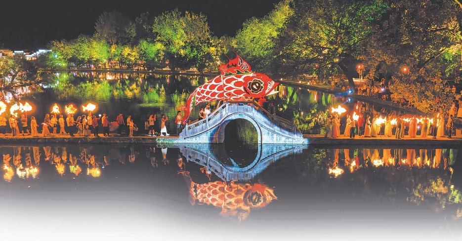 去年12月,电视剧《家业》在呈坎景区取景,其中的“盛世徽州鱼灯烟花秀”场景在网上引发热议。“我们迅速响应,斥资30万元独家购入该场景版权。在复刻拍摄场景的同时,叠加鱼灯、舞草龙、徽剧等非遗展演,打造了‘盛世徽州 呈坎社戏 一夜鱼龙舞’沉浸式文旅体验产品。”周越说。