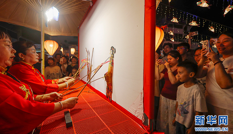 10月2日,游客在安徽省黄山市歙县徽州古城市集观看皮影戏。