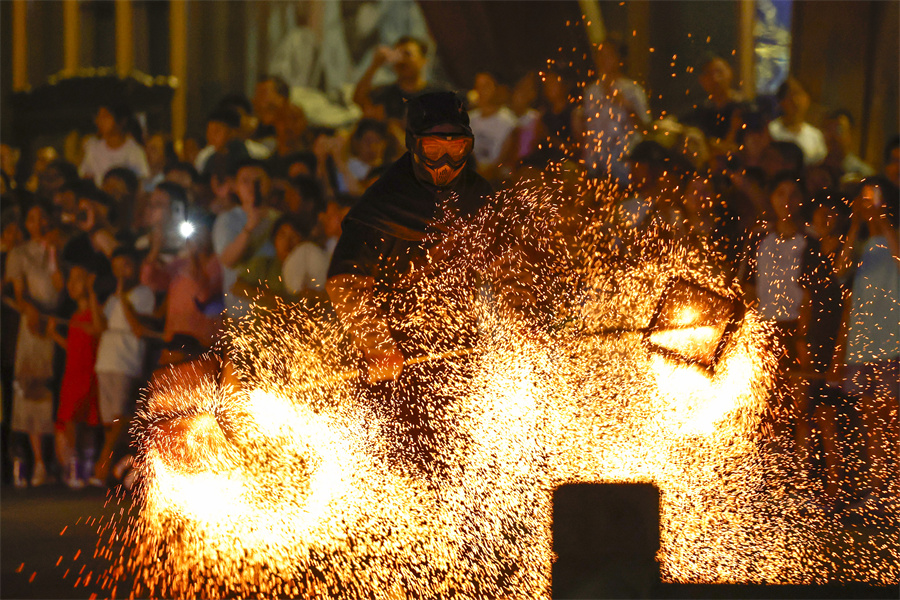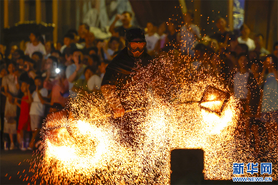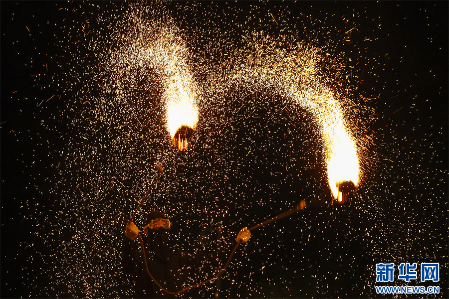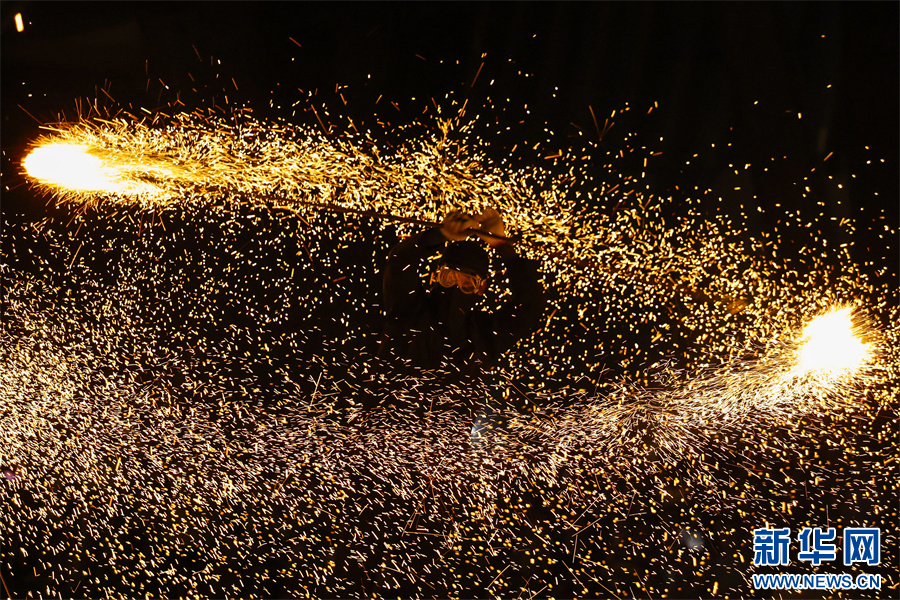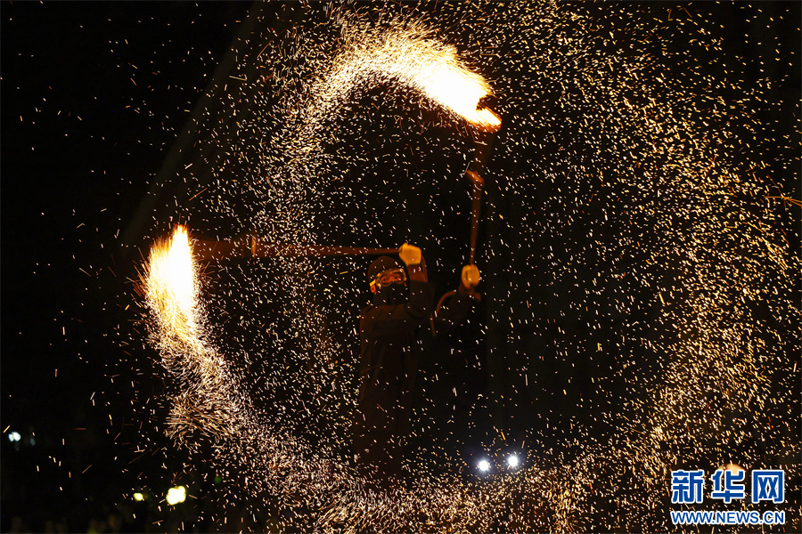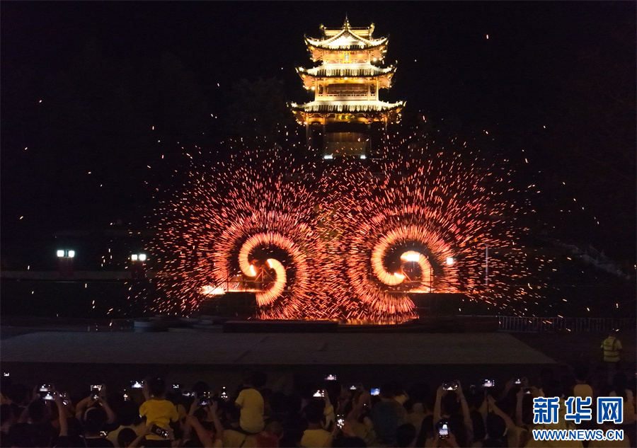 10月4日,表演者在安徽省黄山市休宁县齐云山景区表演打铁花。