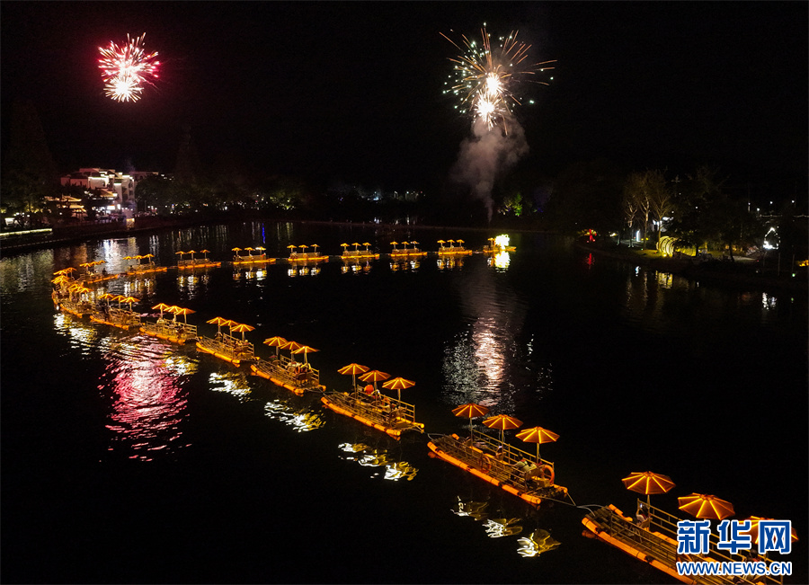 当日,夜幕下的安徽省黄山市休宁县齐云山景区流光溢彩,炭花舞、抖火壶、汪满田鱼灯等民俗项目轮番上演,吸引众多游客前来观赏,乐享假日。