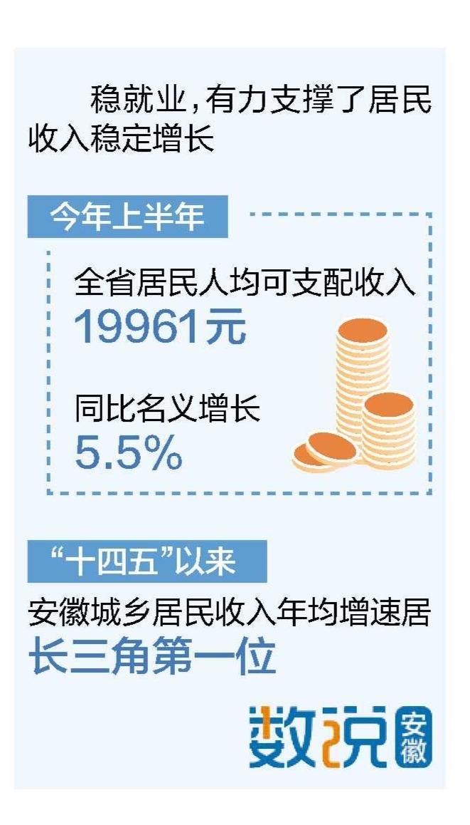 稳就业,有力支撑了居民收入稳定增长。1月至7月,全省城镇新增就业47.5万人,完成年度目标任务的69.86%,超序时进度11.53个百分点。今年上半年,全省居民人均可支配收入19961元,同比名义增长5.5%。“十四五”以来,安徽城乡居民收入年均增速居长三角第一位。