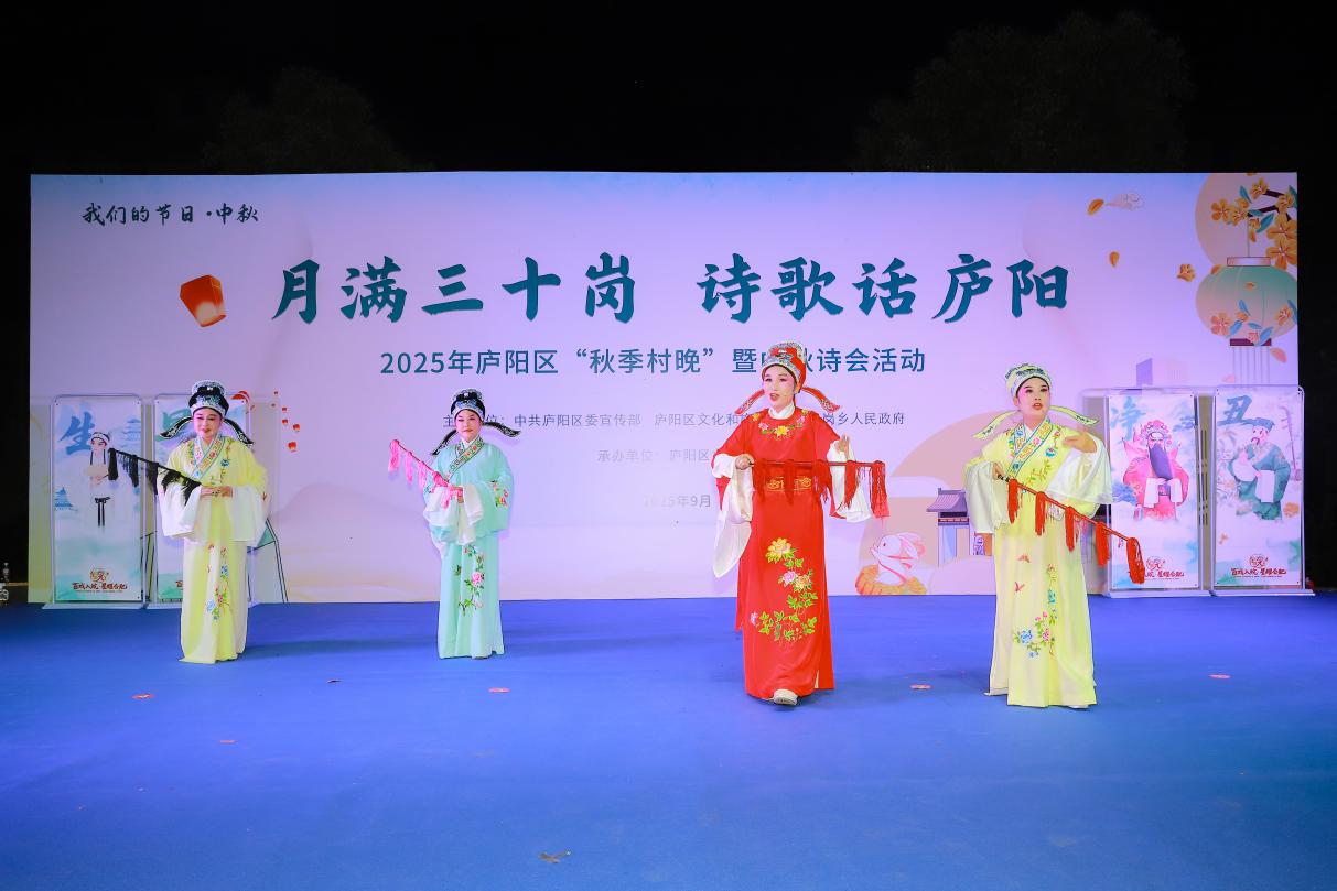 晚会在舞蹈《花海春潮》的翩跹舞姿中拉开帷幕。庐剧《商林游春》与黄梅戏《十五的月亮为谁圆》依次登台,艺术家们唱腔醇厚、表演传神,将国家级非遗代表性项目的历史底蕴与戏曲艺术的声韵之美展现得淋漓尽致。诗歌朗诵《水调歌头·明月几时有》《灯火庐州》带领观众品味诗意中秋,感受庐阳升腾的烟火气息。小品《歪瓜上热搜》以轻松诙谐的方式,生动展现乡村振兴中的新产业、新风貌。整场演出精彩纷呈,掌声不断。