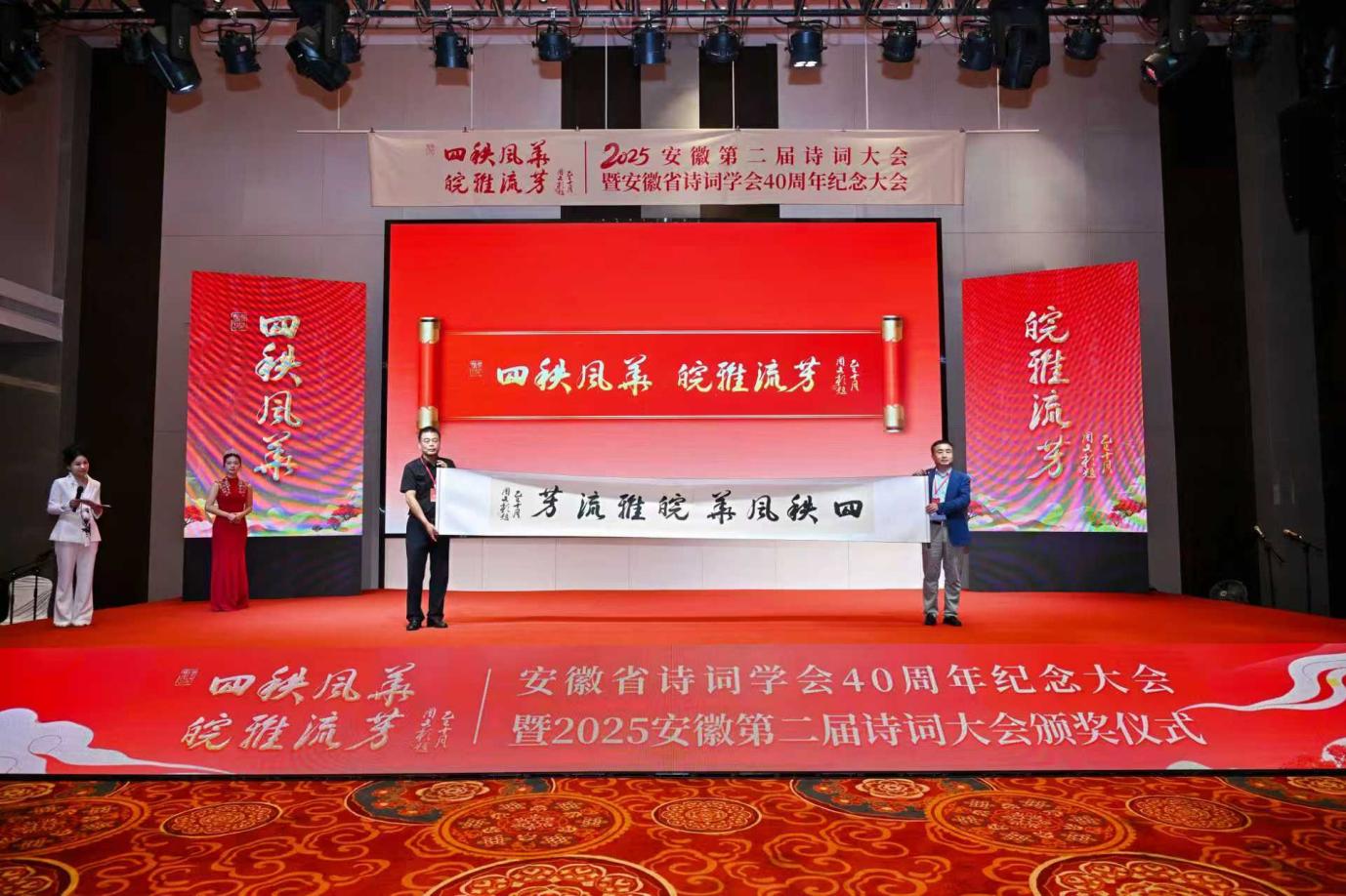10月2日至4日,“2025安徽第二届诗词大会暨安徽省诗词学会40周年纪念大会”在合肥举行。这场以“四秩风华皖雅流芳”为主题的文化盛会,集诗词竞技、文化传承与学术交流于一体,不仅为全省诗词爱好者搭建了展示才华的舞台,更以厚重底蕴与创新形式,为省诗词学会40周年书写了璀璨篇章,成为一场浸润徽风皖韵的文化盛宴。
