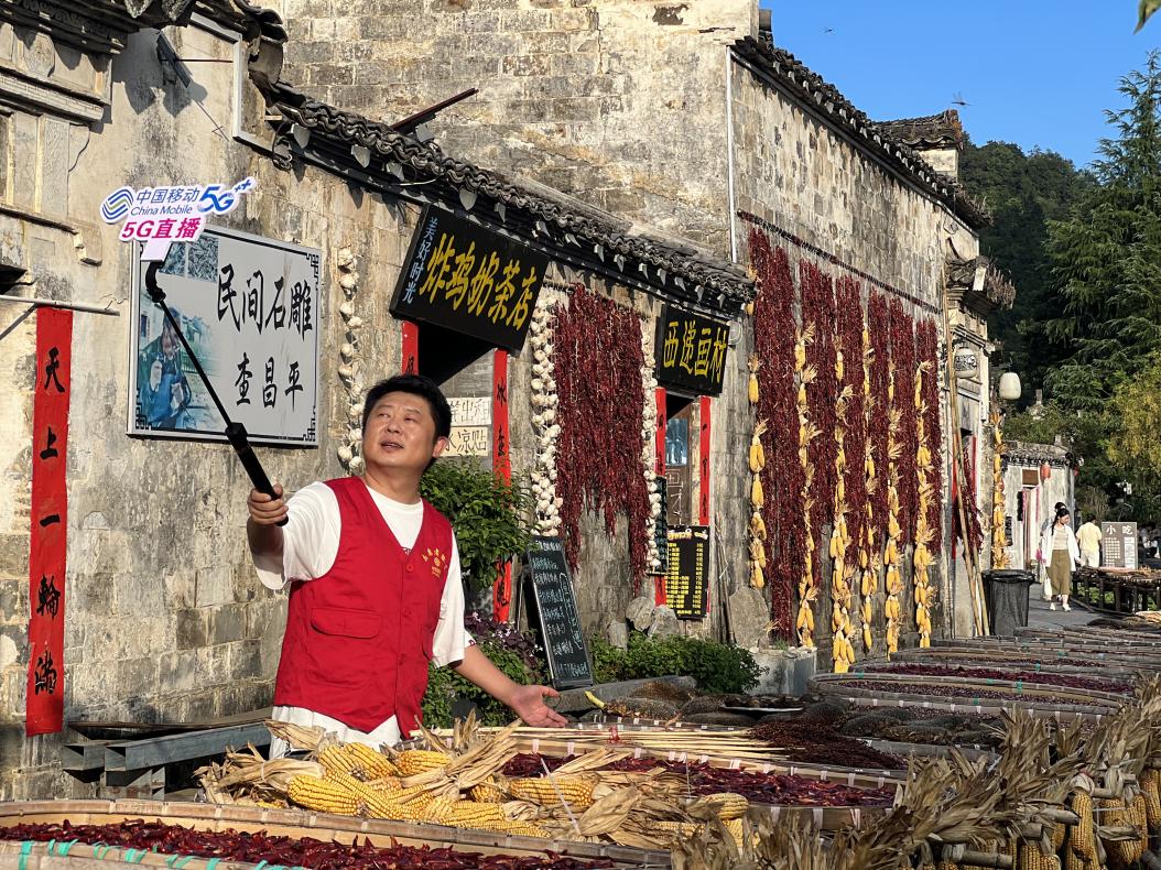 安徽移动工作人员在满目秋色中开启5G直播。