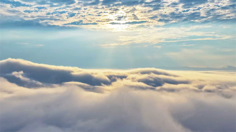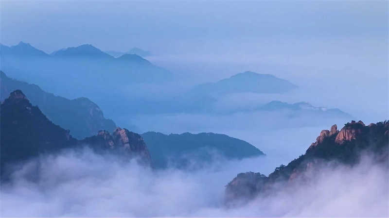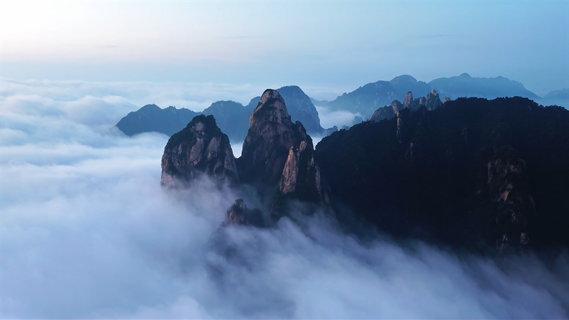 近日,位于安徽省池州市的九华山风景区云雾缭绕。陡峭的峰林探出身姿,宛如精心雕琢的神秀雕塑;云海如浪涛般层层铺展,被轻柔洒落的晨光映照着,如梦似幻。