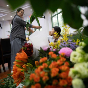 10月10日,在位于安徽合肥的一家花店,付玉兰挑选用于插花创作的花材。