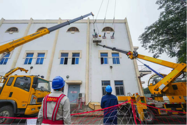 “吊车就位,注意保持安全距离!”在地面人员指挥下,特种作业车的吊臂缓缓升起,在穿墙套管上方约3米处稳稳停住。高空中的作业人员默契配合,将吊带牢牢固定于套管上。