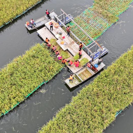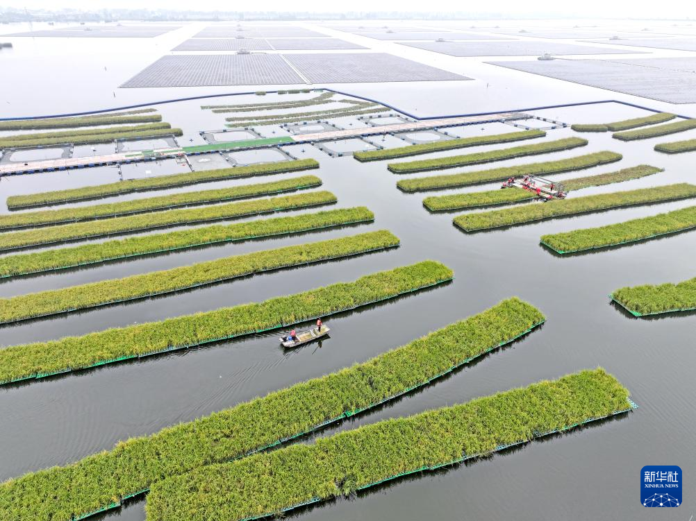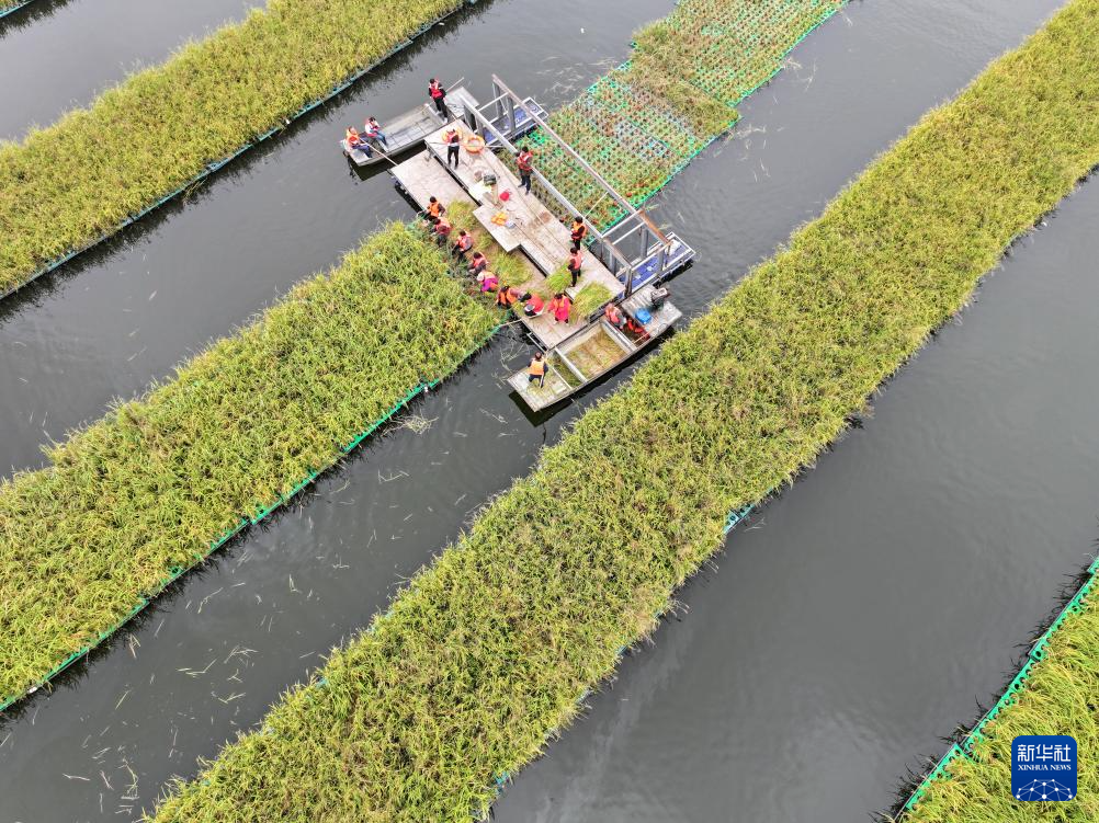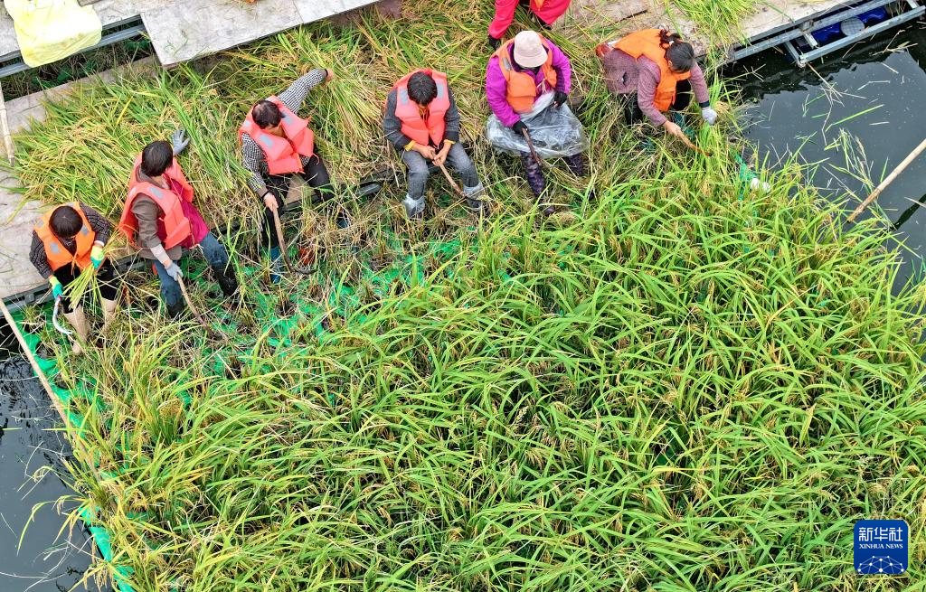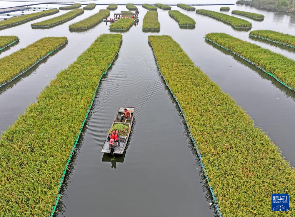近日,安徽省淮南市凤台县顾桥镇采煤沉陷区50亩漂浮式水稻迎来丰收。当地积极探索采煤沉陷区综合治理开发利用,在采煤沉陷区推行水面漂浮水稻种植、水下网箱养鱼、水上光伏电站等多种发展模式,科学利用好采煤沉陷区。
