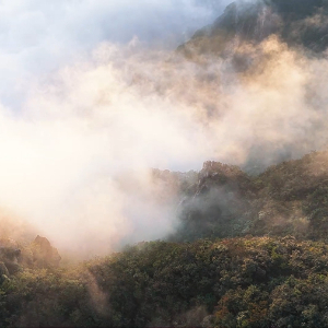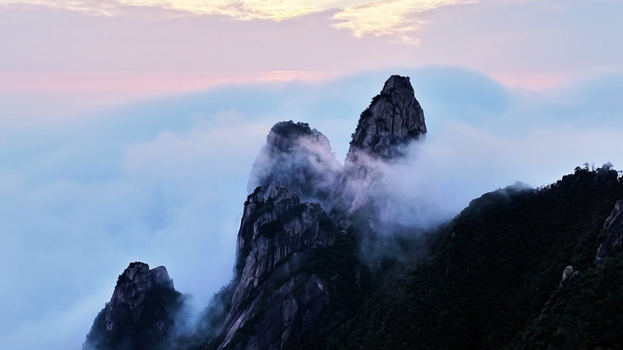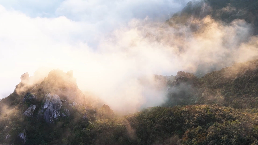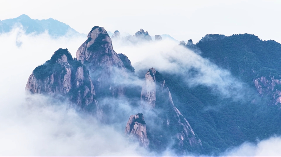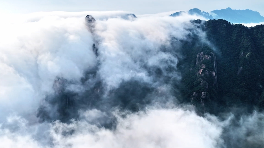 秋日时节,雨后的安徽九华山风景区,云雾似被舞动的白练,从山巅奔涌而下,时而云浪翻涌,时而轻拢成纱,藏青色峰尖在雾中时隐时现,构成了一幅流动的丹青画卷。