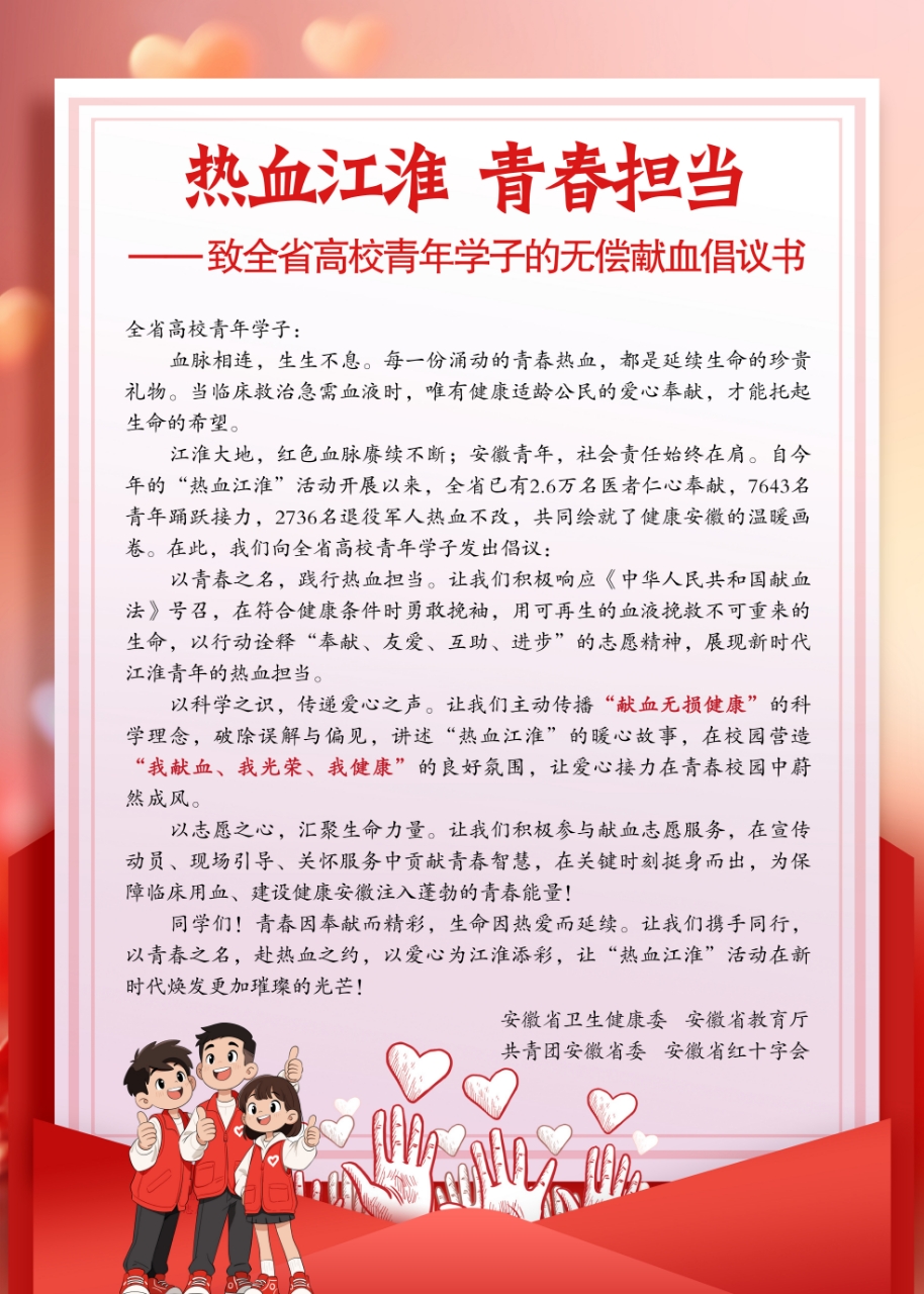 同学们!青春因奉献而精彩,生命因热爱而延续。让我们携手同行,以青春之名,赴热血之约,以爱心为江淮添彩,让“热血江淮”活动在新时代焕发更加璀璨的光芒!