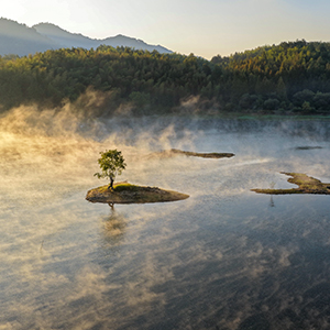当日是霜降节气,安徽省黄山市黟县奇墅湖上晨雾弥漫,金色的霞光洒在湖面,熠熠生辉,引人入胜。新华网发(施亚磊 摄)