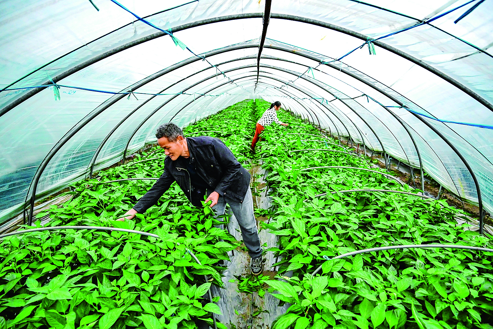 10月16日,和县历阳镇农民正在抢抓农时,对蔬菜大棚内的辣椒整枝打杈。当前,该县正通过科学管理,提升辣椒品质与产量,保障今冬明春百姓“菜篮子”丰盈。