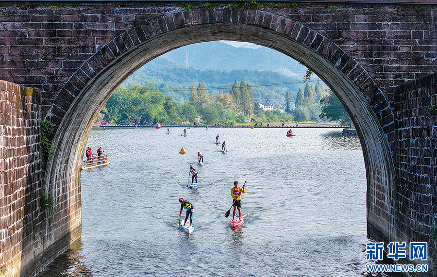 当日,2025年安徽省桨板公开赛在黄山市休宁县齐云山横江水域火热开赛。赛事吸引了来自长三角地区近200名桨板爱好者参与,在齐云山秀美的山水画卷间挥桨破浪,激烈角逐。新华网发(施亚磊 摄)