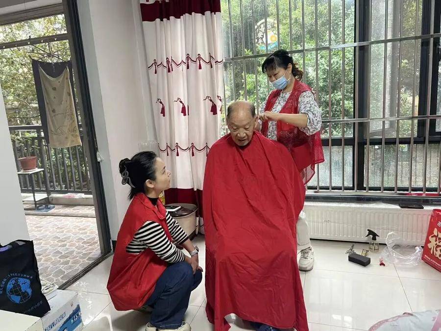 蜀山好人、金湖社区爱心理发志愿服务队队长许银芳上门为行动不便的老人理发。