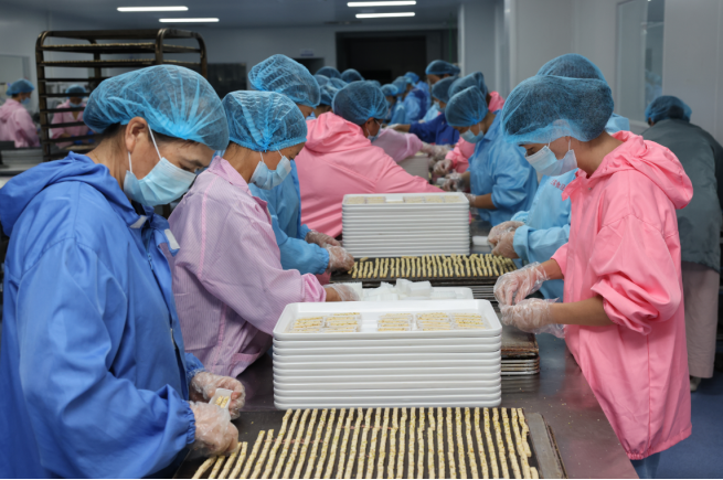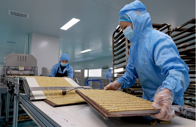 与此同时,在该园区的安徽兰客食品科技有限公司,一股诱人的烘焙香气扑面而来,宽敞明亮的车间内,六条生产线正在高效运转,近百名工人正在不同岗位有条不紊地开展工作,一箱箱坚果酥等食品经过十几道工序检测合格后,发往全国各地。